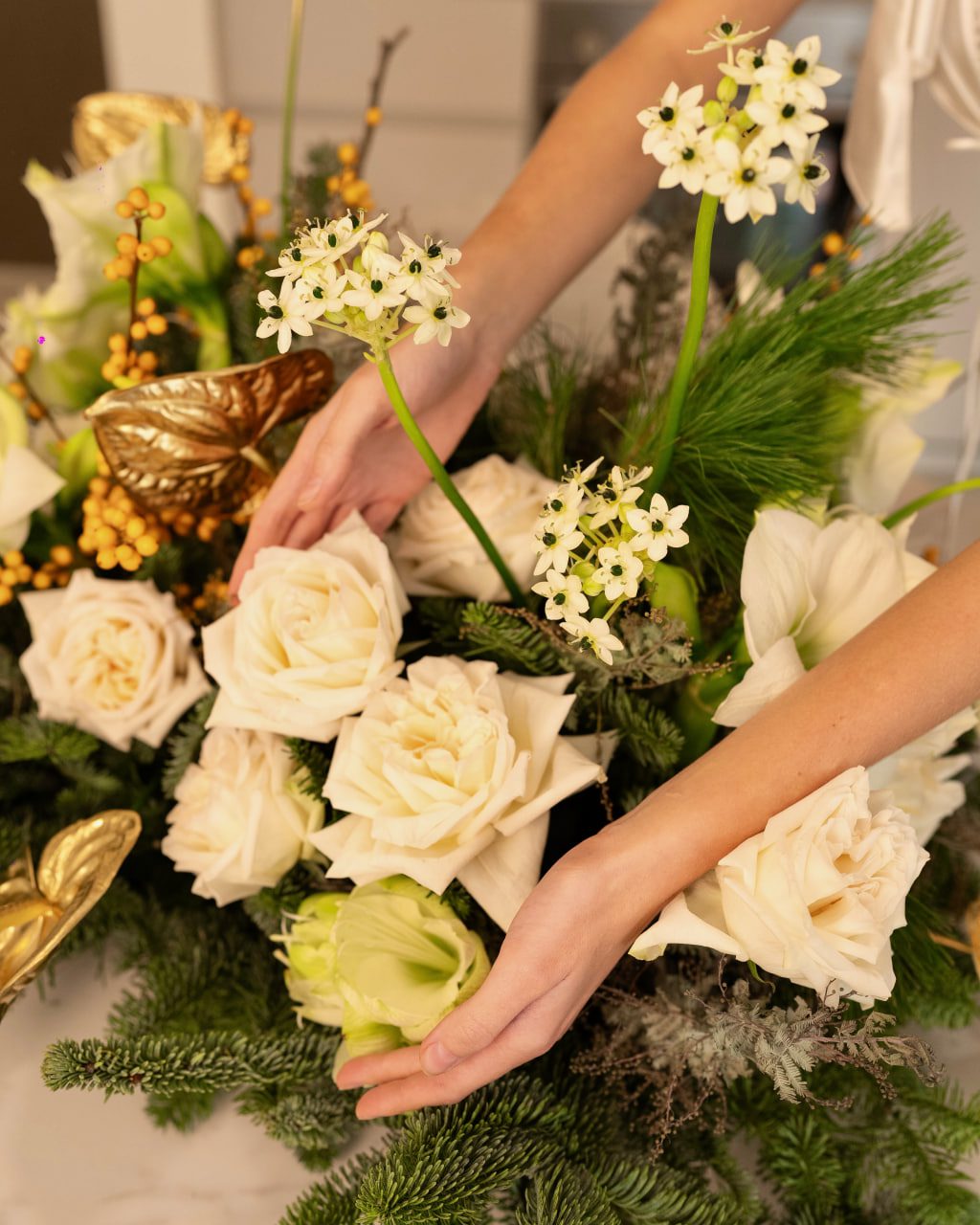 Amaryllis, rose, ilex, anthurium, mixed conifer greens